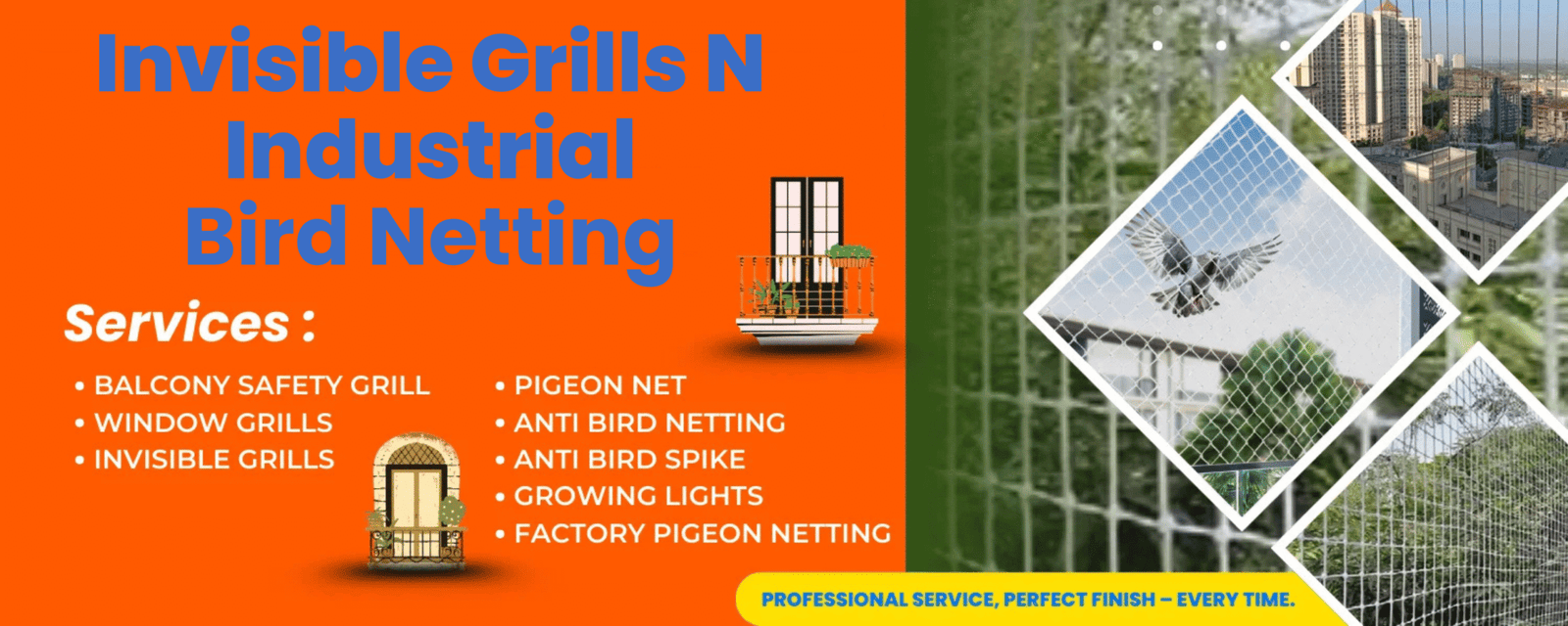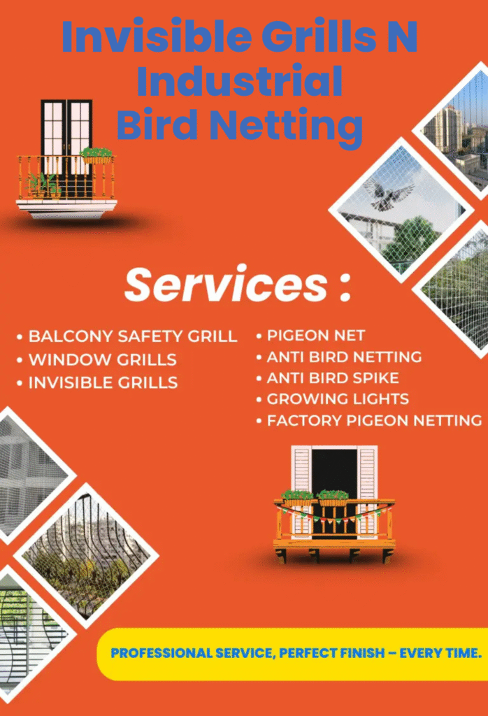 we specialize in delivering smart, safe, and stylish protection solutions for your home, office, and industrial spaces. With a commitment to quality and customer satisfaction, we offer the most trusted and modern options for balcony grills, invisible grills, pigeon netting, anti-bird spikes, and complete bird-proofing systems.